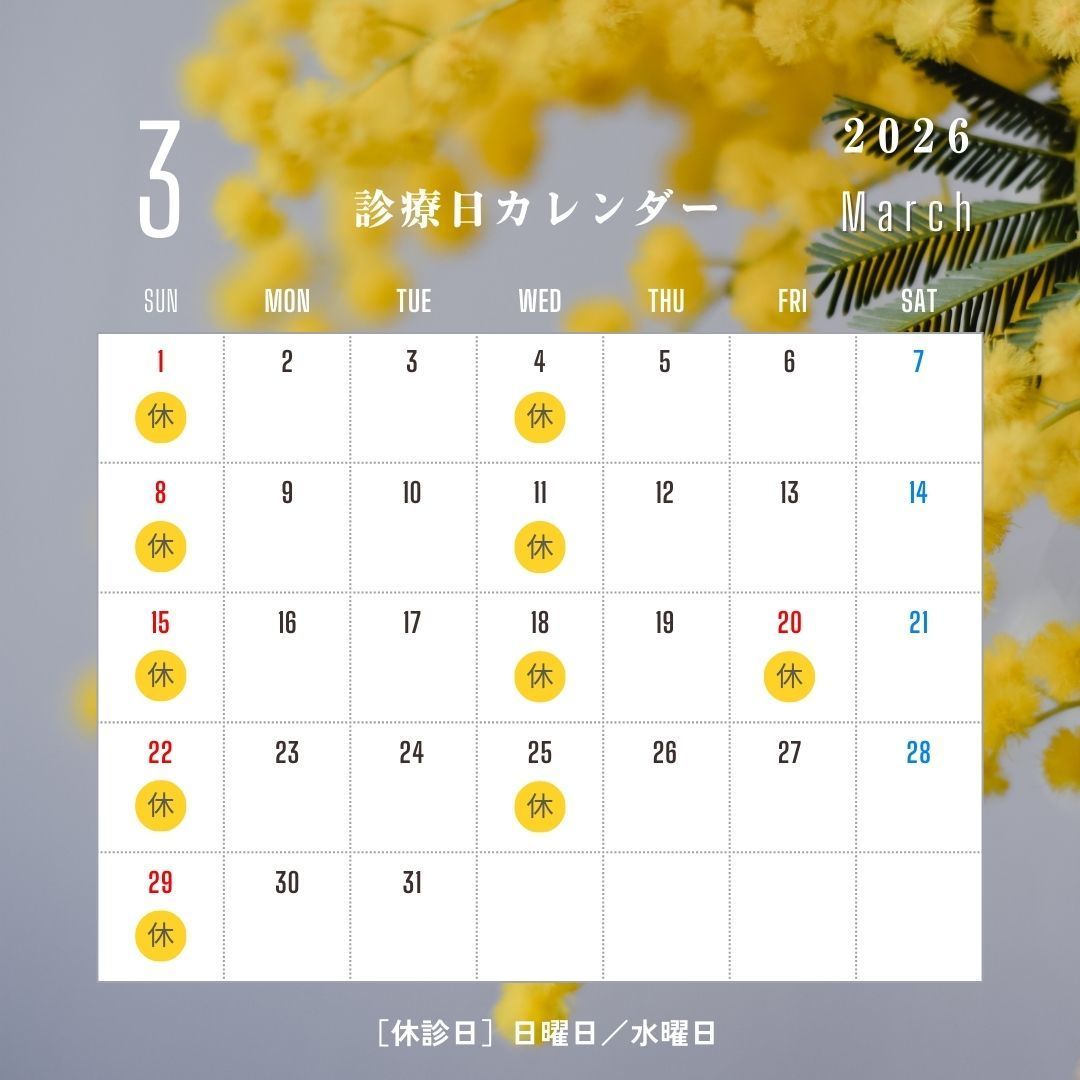 休診日:日曜・水曜・祝祭日 ※祝祭日は診療の場合もありますので、お問合せください。